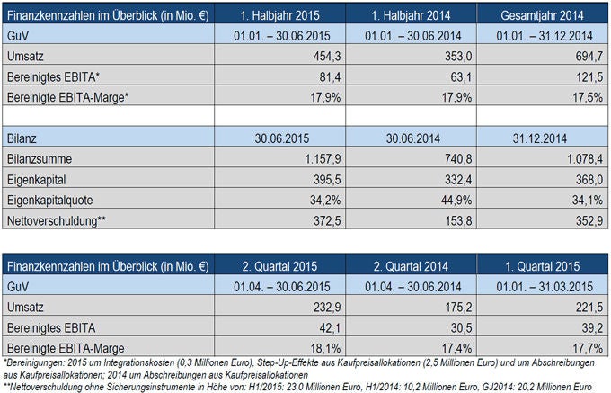 Im zweiten Quartal 2015 wuchs der Konzernumsatz im Vergleich zum Vorjahresquartal um 32,9 Prozent auf 232,9 Millionen Euro (Q2 2014: 175,2 Millionen Euro). Das bereinigte EBITA stieg von April bis Juni 2015 um 38,3 Prozent auf 42,1 Millionen Euro (Q2 2014: 30,5 Millionen Euro). Die bereinigte EBITA-Marge lag im zweiten Quartal bei 18,1 Prozent (Q2 2014: 17,4 Prozent). Der Auftragsbestand erreichte zum Stichtag 30. Juni 2015 302,4 Millionen Euro und lag damit 19,9 Prozent über dem Vergleichswert des Vorjahres (H1 2014: 252,1 Millionen Euro).