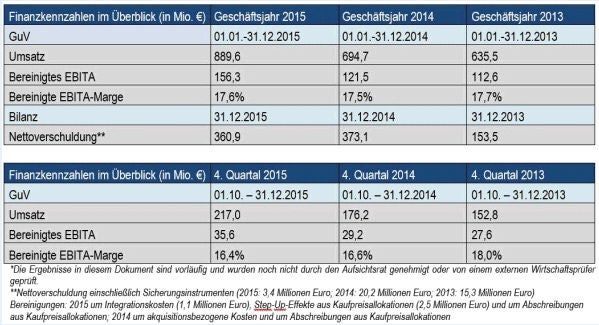 Im vierten Quartal 2015 erhöhte sich der Umsatz deutlich um 23,2 Prozent auf 217,0 Millionen Euro gegenüber dem Vorjahresquartal (Q4 2014: 176,2 Millionen Euro). Dazu haben Akquisitionen mit 10,0 Millionen Euro beigetragen. Organisch lag das Wachstum im vierten Quartal 2015 bei 10,4 Prozent. Das bereinigte EBITA verbesserte sich um 22,0 Prozent auf 35,6 Millionen Euro (Q4 2014: 29,2 Millionen Euro). Damit lag die bereinigte EBITA-Marge von Oktober bis Dezember 2015 bei 16,4 Prozent (Q4 2014: 16,6 Prozent).