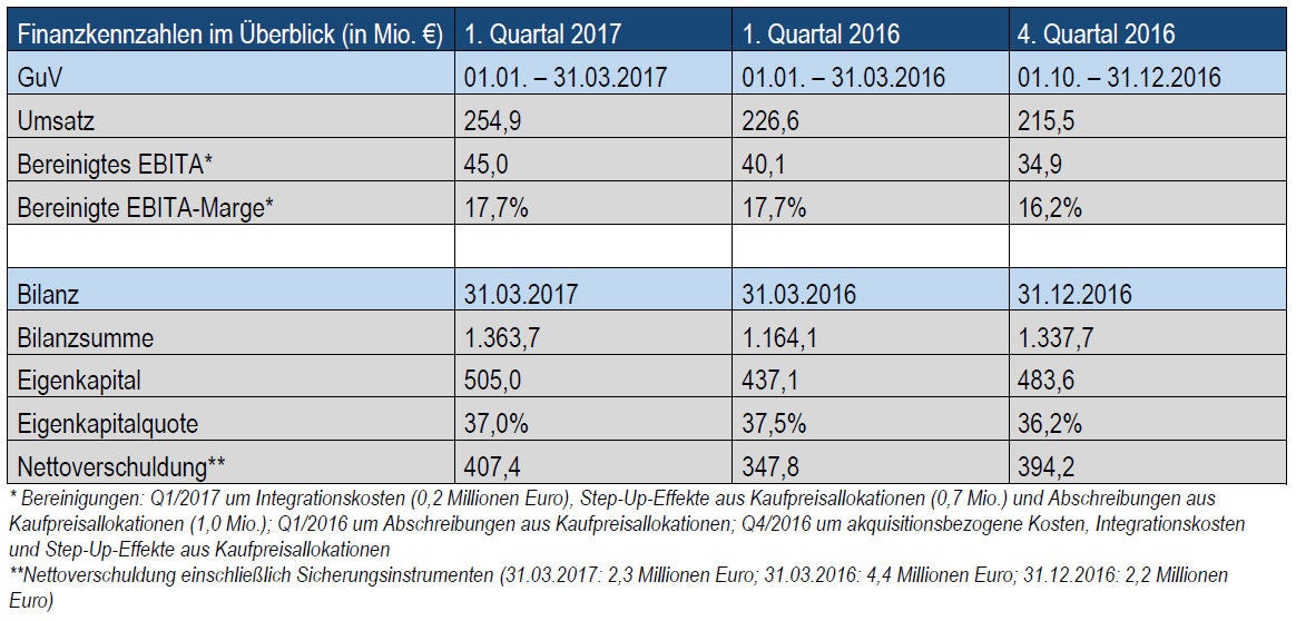 Die NORMA Group, ein internationaler Marktführer für hochentwickelte Verbindungstechnologie, ist im ersten Quartal 2017 solide gewachsen. Der Umsatz nahm im Vergleich zum Vorjahresquartal um 12,5 Prozent auf 254,9 Millionen Euro zu (Q1 2016: 226,6 Millionen Euro). Dabei betrug das organische Wachstum 4,6 Prozent und das akquisitorische Wachstum 6,5 Prozent. Währungseffekte trugen mit 1,4 Prozent positiv zum Wachstum bei. Das bereinigte Ergebnis vor Zinsen, Steuern und Abschreibungen auf immaterielle Vermögenswerte (bereinigtes EBITA) stieg in den ersten drei Monaten 2017 um 12,2 Prozent gegenüber dem Vorjahreszeitraum auf 45,0 Millionen Euro (Q1 2016: 40,1 Millionen Euro). Die bereinigte EBITA-Marge lag mit 17,7 Prozent unverändert auf einem nachhaltig hohen Niveau (Q1 2016: 17,7 Prozent).
