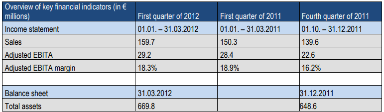 The Americas region proved to be a growth driver in the first three months of 2012. Sales figures in this region rose from EUR 42.6 million last year to EUR 50.2 million. This sharp increase of 17.9% was primarily due to strong organic growth with significantly higher volumes.