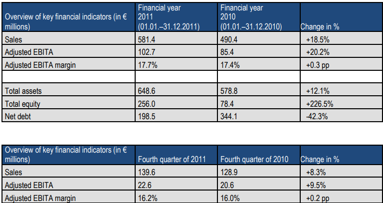 NORMA Group expects mild growth in Germany and most Northern European markets. Southern European markets, on the other hand, will be influenced by macroeconomic developments in individual countries. NORMA Group expects Group sales in 2012 to grow by between 3% and 6% overall compared to the previous year. Sales growth is expected to accelerate further in 2013 compared to 2012. From an operating perspective, NORMA Group intends to achieve an EBITA margin in 2012 that is at least equivalent with the adjusted margins of the previous two years (2010: 17.4%, 2011: 17.7%).