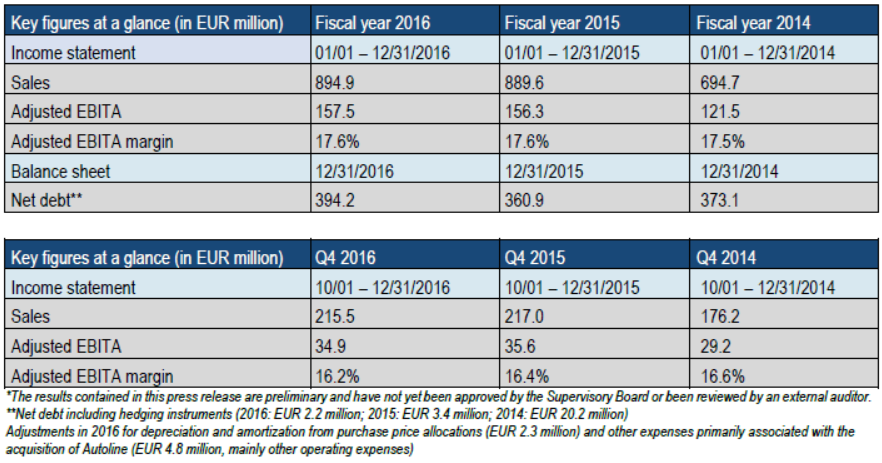 According to preliminary and unaudited figures, sales decreased by a slight 0.7 percent in the fourth quarter of 2016 to EUR 215.5 million compared to the fourth quarter of 2015 (Q4 2015: EUR 217.0 million). The acquisition of Autoline contributed EUR 3.5 million to fourth quarter sales in 2016. Adjusted EBITA fell by 2.1 percent to EUR 34.9 million in the fourth quarter of 2016 compared to the period October to December 2015 (Q4 2015: EUR 35.6 million). The adjusted EBITA margin was 16.2 percent (Q4 2015: 16.4 percent).