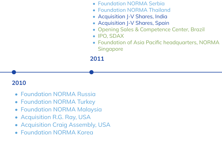 Depuis 2011, nous sommes cotés à la Bourse de Francfort et inclus dans l’indice SDAX. Grâce à une offre de produits diversifiée et à des investissements stratégiques sur des marchés de croissance, NORMA Group vise à créer de la valeur à long terme, tout en renforçant sa crédibilité par une communication transparente et continue avec ses actionnaires. Cliquez ci-dessous pour accéder aux dernières informations, aux rapports et aux coordonnées de notre équipe Relations Investisseurs.